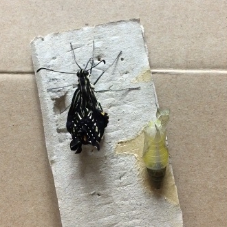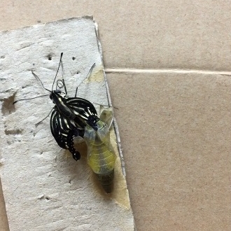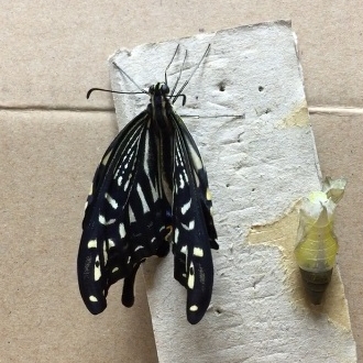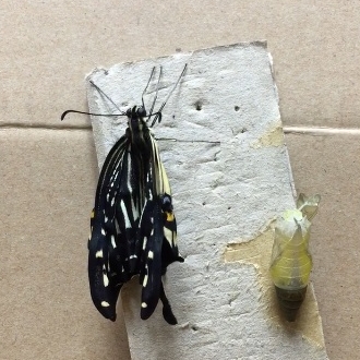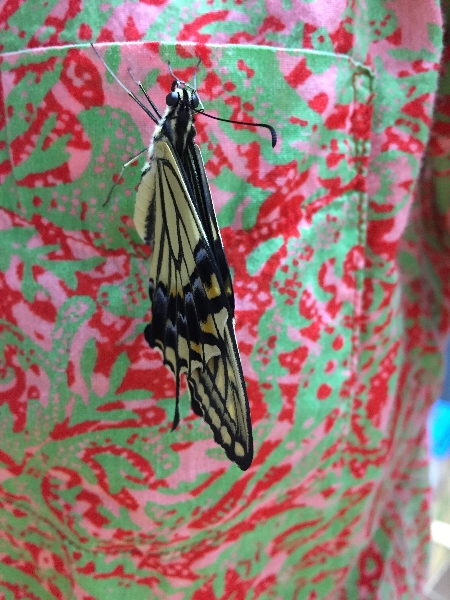 思わず手を差し伸べて救い上げた時に触れた羽はまだふにゃふにゃで、今変な癖が付いたら飛べなくなってしまうので、ひやひやしながら粗相のないようそーっと蝶の止まった手を動かすと、彼女(またまた女子)は大急ぎでつかまりやすい私のシャツの胸ポケットに移動しました。