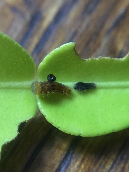 〔注〕ナミアゲハの幼虫はミカン、レモン、ハッサク、ユズ、キンカンなど柑橘類や同じくミカン科のサンショウの葉を食べます。