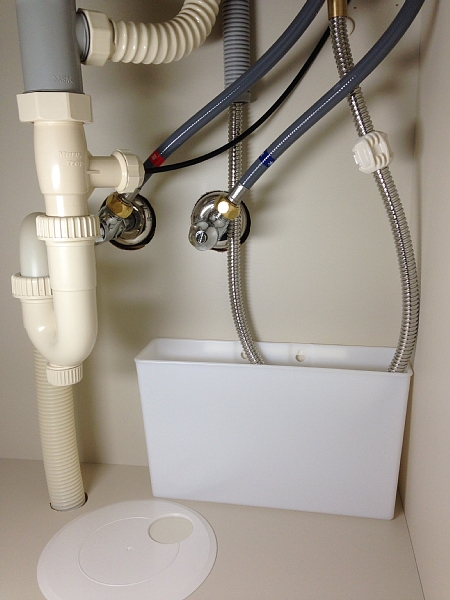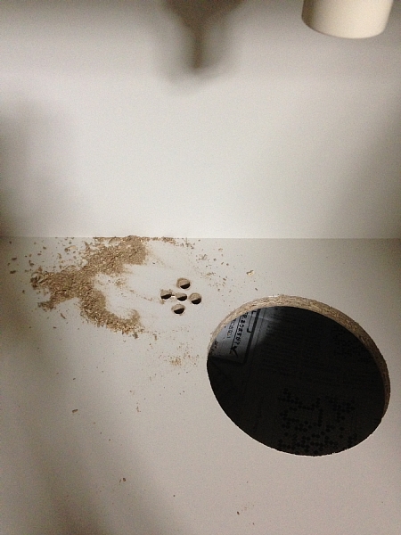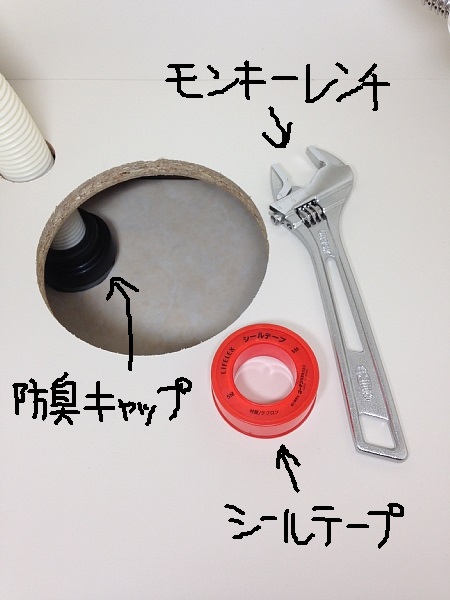 我が家の洗面所の排水口は何故か左に寄っていて、洗面台に元々ある穴からアクセスしにくい位置にあるため、以前の排水ホースは少し斜めに傾き防臭キャップは半開きで被さっていたので、この機会にホースがストレートに排水口へ向かうよう新たな穴を開けます。