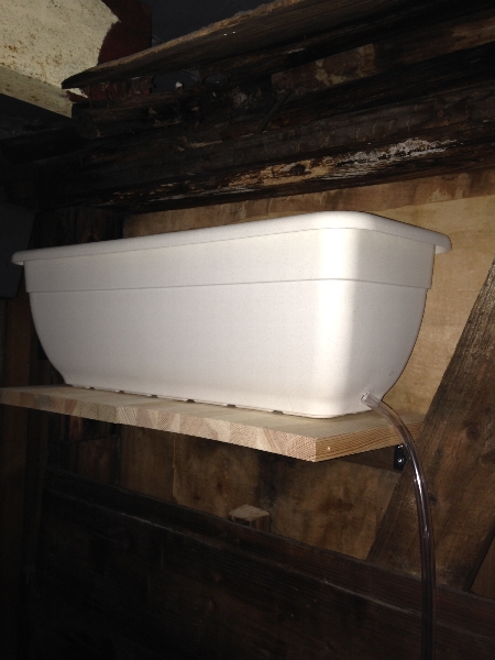 以前から大雨に備えて私の手の届く所で最も水源(?)に近いと思われる2階のベランダの壁に棚を作り壁に沿うよう細長いバケツを置いていたものの、ここ最近の雨はそのバケツを軽く超越する天の恵みであり、結果、1階店舗の花の上にまで降り注がんとするので、どうしたものかと思案していました。