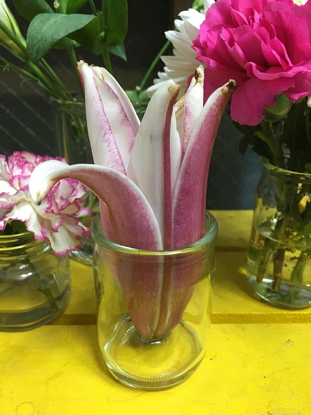 蕾だけで茎もほとんどない状態ですが、こんな風に水を少~し入れて立てておくと、どんどん咲いてきます。