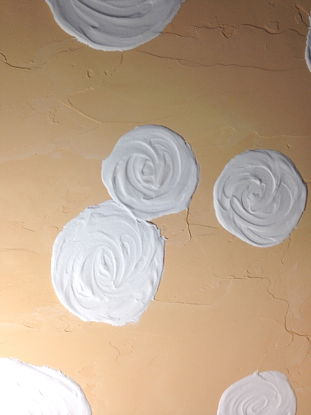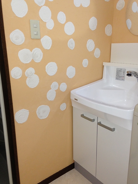 実はこの模様、最後の最後で漆喰が足りなくなって、何とか塗り切ったものの不均等になってしまった厚みをごまかそうとペタペタ触ってできたものです。