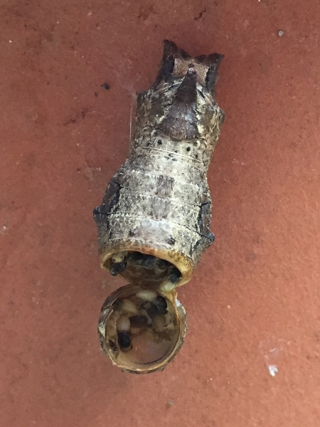 明けて30日、新聞紙とネットをそーっと外すと、蛹はもう真っ黒を通り越して中身と殻に隙間ができて白っぽくなっていました。
