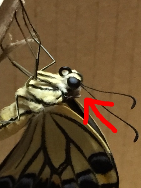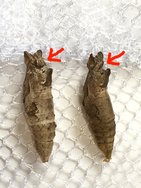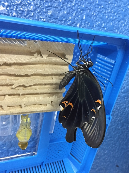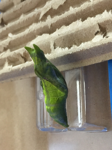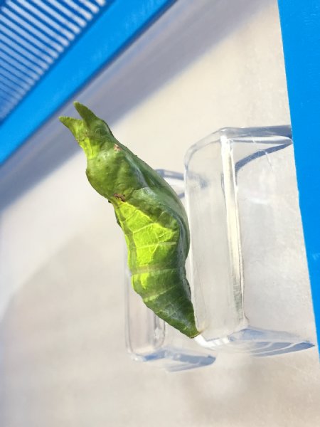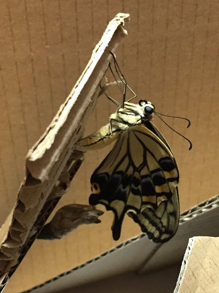 〔注〕アゲハチョウには秋に蛹になり越冬するものもいるが、越冬するかしないかの分かれ目は日照時間や気温に関係するようなので、暗くてあまり暑くない室内にいれば越冬とまではいかなくても性急な羽化は思いとどまってくれるかなと。