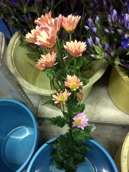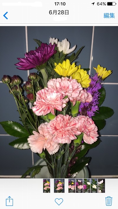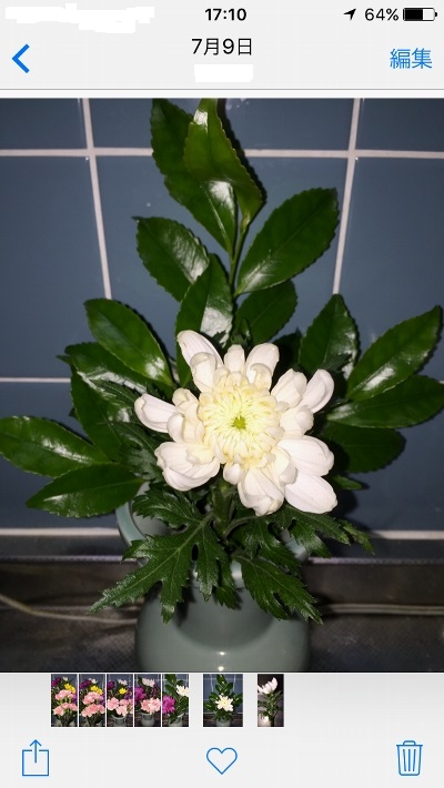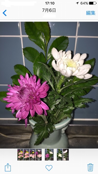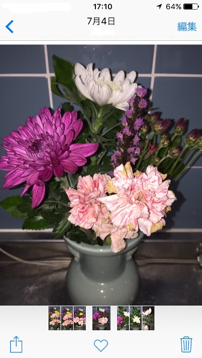 7月6日。残念ながら赤い小菊はほとんど咲く前に茎が腐って水を吸えなくなり、終了。リアトリスは、やるだけのことはやったって感じ。さすがに大菊は強いなぁ。既に11日経過です。