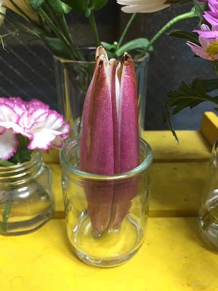 蕾だけで茎もほとんどない状態ですが、こんな風に水を少~し入れて立てておくと、どんどん咲いてきます。