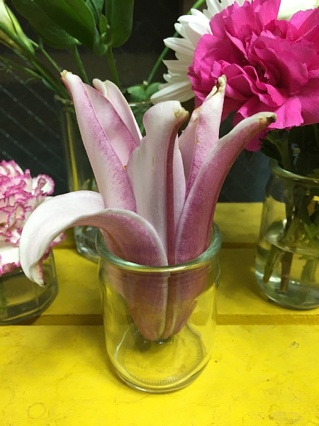 サンバの名の通り踊るように自由奔放な花弁、茎を立てた状態でひまわりのように花が正面を向くところなんか、とても生けやすいしカワイイと思うのに、とにかく客層が保守的な当店では案の定不人気でした。