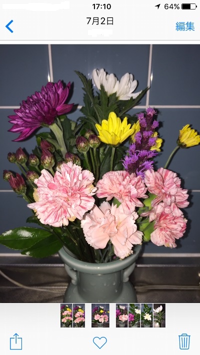 7月6日。残念ながら赤い小菊はほとんど咲く前に茎が腐って水を吸えなくなり、終了。リアトリスは、やるだけのことはやったって感じ。さすがに大菊は強いなぁ。既に11日経過です。